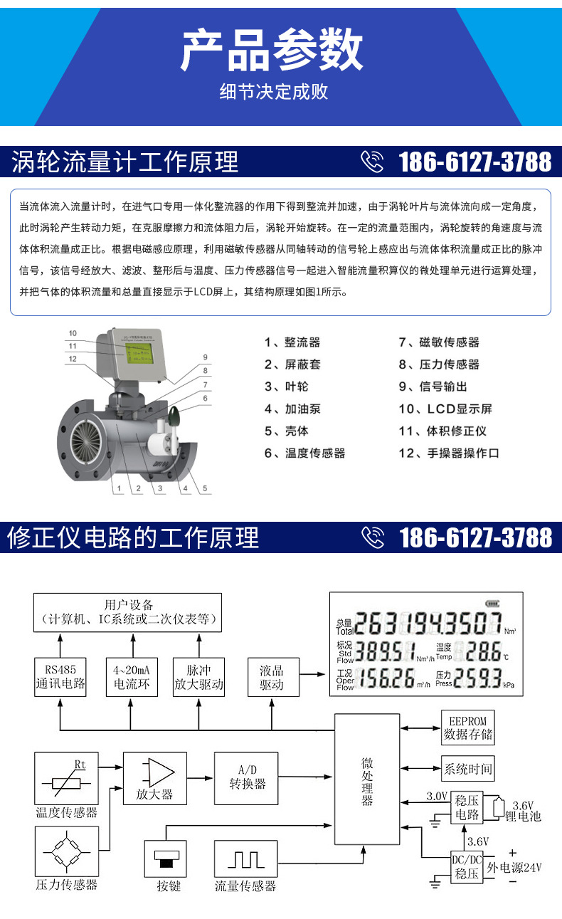 當(dāng)流體流入流量計時,在進氣口專用一體化整流器的作用下得到整流并加速,由于渦輪葉片與流體流向成一定角度此時渦輪產(chǎn)生轉(zhuǎn)動力矩,在克服摩擦力和流體阻力后,渦輪開始旋轉(zhuǎn)。在一定的流量范圍內(nèi),渦輪旋轉(zhuǎn)的角速度與流體體積流量成正比。根據(jù)電磁感應(yīng)原理,利用磁敏傳感器從同軸轉(zhuǎn)動的信號輪上感應(yīng)出與流體體積流量成正比的脈沖信號,該信號經(jīng)放大、濾波、整形后與溫度、壓力傳感器信號一起進入智能流量積算儀的微處理單元進行運算處理并把氣體的體積流量和總量直接顯示于LCD屏上,其結(jié)構(gòu)原理如上圖所示